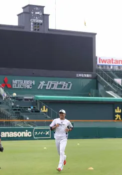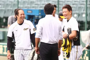阪神・梅野、青柳、岩崎が侍ジャパン稲葉監督と甲子園で再会 笑顔であいさつ