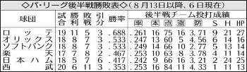 【Weekly Data展望】ロッテが今季初めて単独首位に浮上した。東京五輪後の後半戦は11勝5敗3分け(勝率・688)と好調。オリックス、ソフトバンクの8勝7敗3分け(・533)を大きく上回っている。この間、チーム打率・261、本塁打16本、16盗塁はいずれもリーグトップ(タイも含む)と攻撃力のバランスがいい。シーズンを通してもチーム打率・2521(2位)、本塁打97本(1位タイ)、盗塁90(1位)と高い数字。ロッテがこの3部門1位なら球団史上初めてになる。