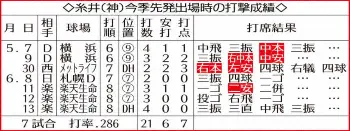 得点力アップの鍵を握るのが、相手投手との相性などを熟慮した上で組まれる日替わりオーダーだ。4、5日の巨人戦は打順を固定。ただ、5試合ぶりに先発復帰させた佐藤輝は、2試合とも無安打に終わった。特に5日は6回の守備から途中交代。プロ入り最長の12試合33打席連続無安打と苦闘は続く。加えて、7日に先発予定の奥川に対しては7打数無安打3三振。総合的に判断すれば、再びベンチスタートとなる可能性が高い。