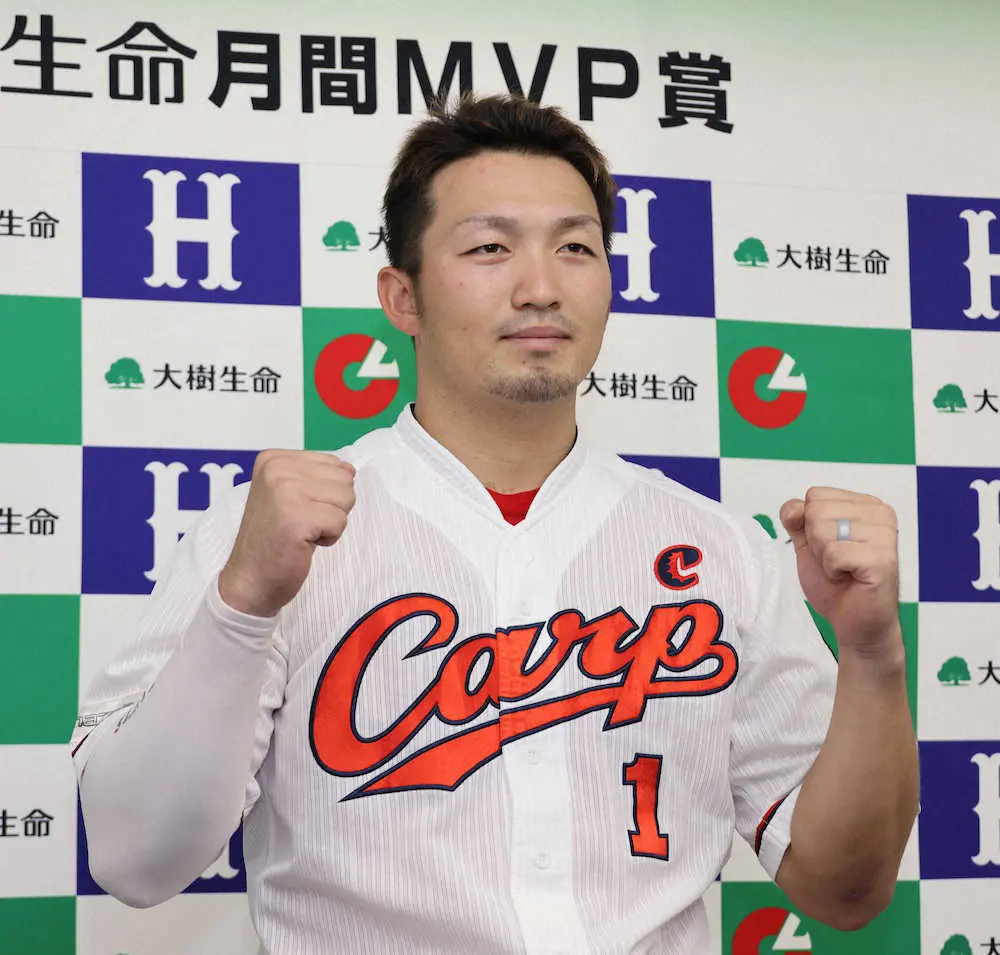 7、8月は打率・333を残し、リーグトップタイの9本塁打、同トップの27打点と活躍。「なかなか獲れる賞ではないのでうれしい。自分でもあまり意識してなくて、気付いたら獲れていたという感覚だった。周りにすごい選手がいる中で、こうやって選んでもらえて光栄です」と喜んだ。