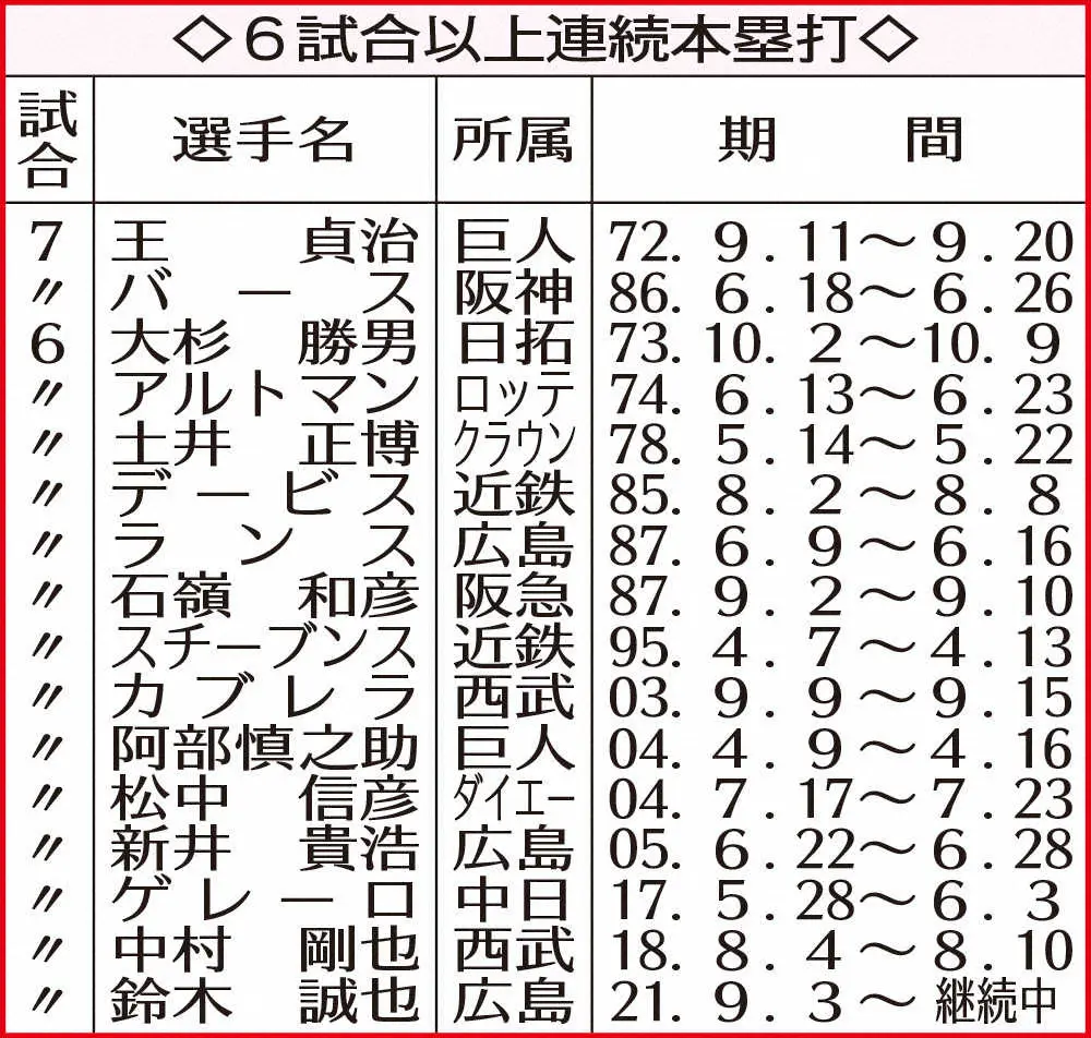 <広・中(20)>4回2死一塁、鈴木誠は左中間に2点本塁打を放つ (撮影・奥 調) Photo by スポニチ 広島・誠也 新井&ランスに並んだ!球団3人目6戦連発「思い切りいった結果… ギャラリーで見る この記事のフォト 2021年09月10日の画像一覧 もっと見る 2021年09月10日の画像をもっと見る