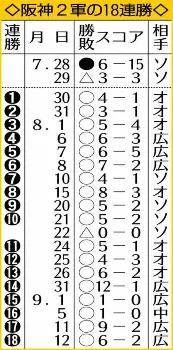 1軍と2軍の違いはあるが、54年南海と60年大毎の最多連勝記録18にも並んだ。平田2軍監督は「ほんとにね、選手には頭が下がるな。(5回は陽川の)四球から5点。野球の怖さを感じさせるゲーム」と振り返った。