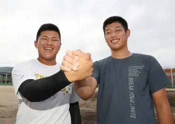 プロを目指す市和歌山・松川(左)と小園(撮影・平嶋 理子)