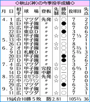 16日は甲子園での指名練習に参加し、キャッチボールなどで最終調整を終えた。チームは1分けを挟み2連敗中。打線も湿りがちで多くの援護が望めそうにない状況で秋山のパフォーマンスにかかる期待は大きい。勝てば11勝目でタイトルを争う自身にも、優勝を目指す自軍にも価値ある1勝になる。