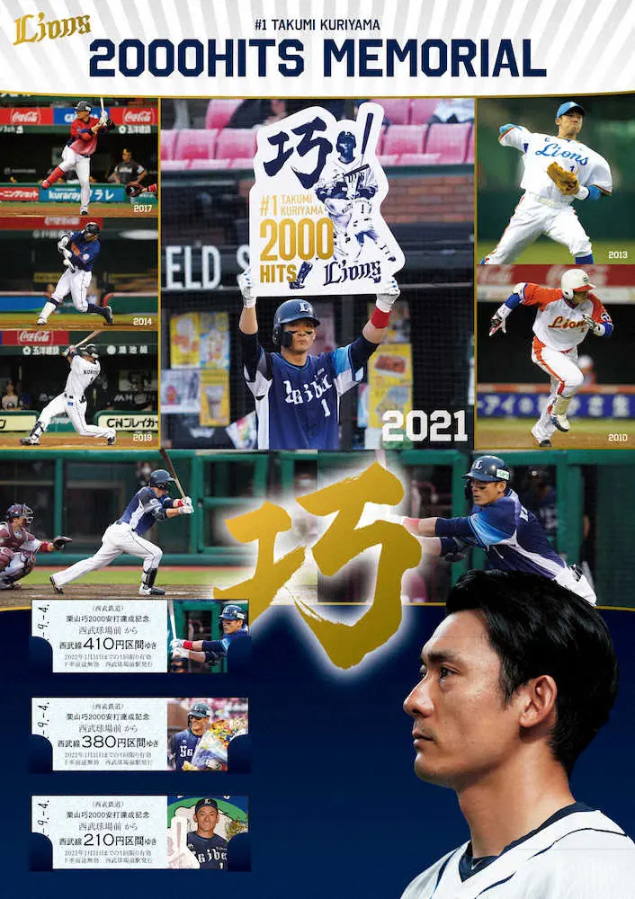 西武は4日の楽天戦で生え抜き初の通算2000安打を達成した栗山の「記念乗車券~Memorial scene~」が発売される。達成翌日から販売された記念乗車券とは別バージョンで、当日の写真を盛り込んだ一品。