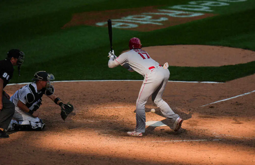 <ホワイトソックス・エンゼルス>9回2死、大谷は死球を受ける(撮影・沢田 明徳)