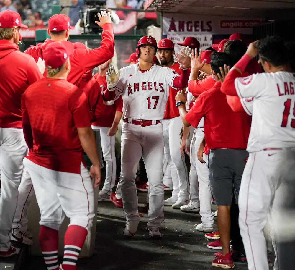 <エンゼルス・アストロス>8回無死、右中間へソロ本塁打を放ちナインの出迎えを受ける大谷(撮影・沢田 明徳)