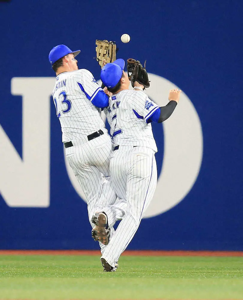 <D・ヤ>4回、サンタナの二塁後方へのフライをオースティン(左)と牧が交錯して捕球できず、二塁打になる(撮影・篠原岳夫)