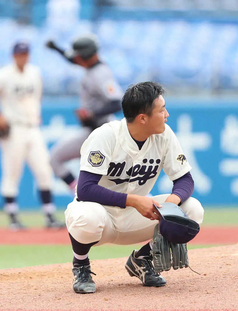 明大の村田賢一(2年=春日部共栄)があとアウト1つで神宮初勝利が消えた。5回2死から藤江星河(1年=大阪桐蔭)を救援、1点リードのまま9回も2アウト。しかし代打・北村に右翼席に運ばれマウンドでしゃがみ込んだ。