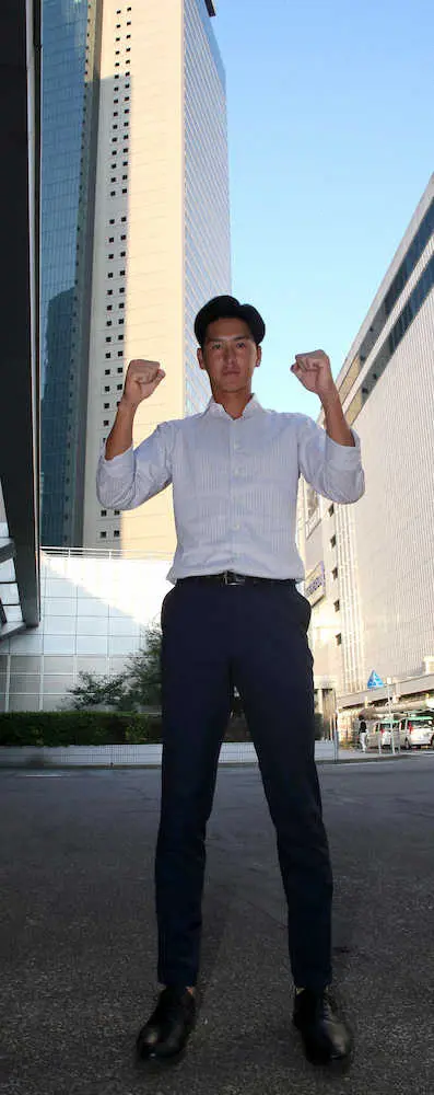 1軍に昇格した巨人・秋広は、宿舎前で気合の入った表情を見せる(撮影・森沢裕)