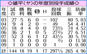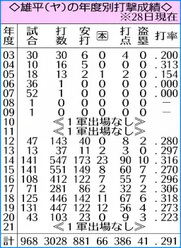 ◇雄平(本名・高井雄平=たかい・ゆうへい)1984年(昭59)6月25日生まれ、神奈川県出身の37歳。東北高では2年時にセンバツ出場。02年ドラフト1巡目で投手としてヤクルト入団。03年6月11日巨人戦でプロ初勝利を挙げるなど1年目から5勝。入団8年目の10年からは打者転向で外野手登録となり、14年にはセ6位の打率.316でベストナイン、15年にはリーグ優勝に貢献した。14、15年球宴出場。1メートル74、83キロ、左投げ左打ち。