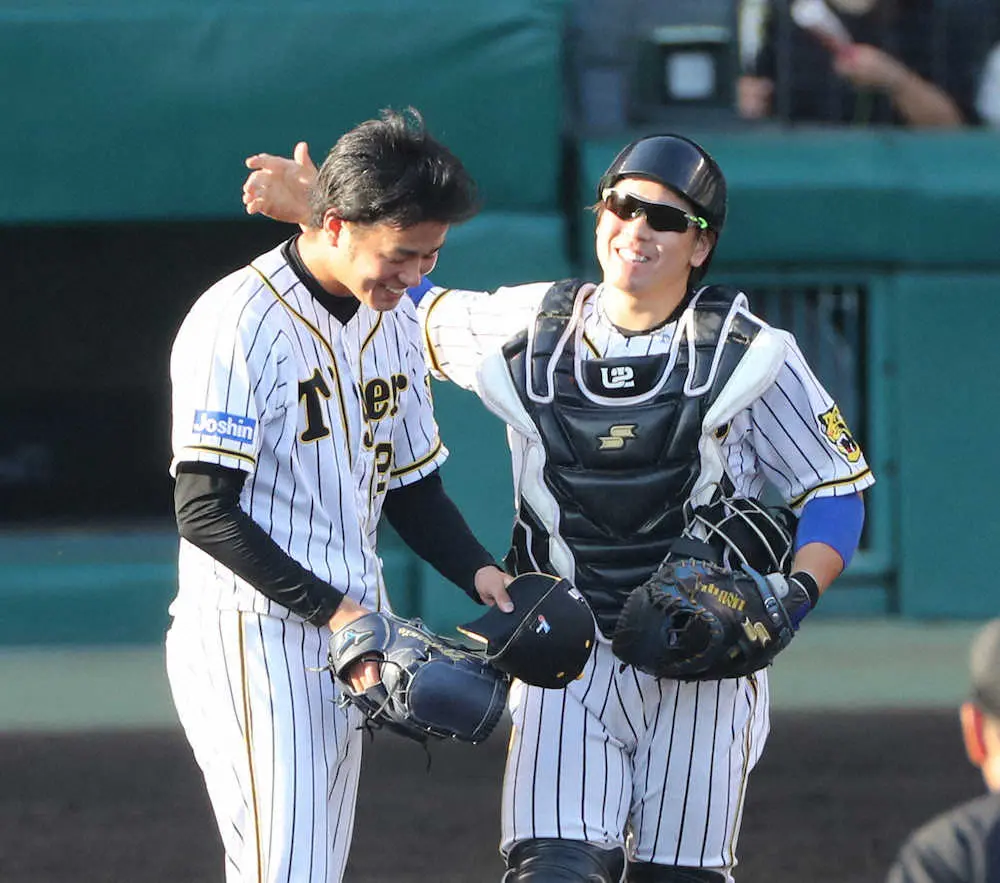 <神・中22> 2試合連続の完封勝利を挙げた高橋(左)は梅野にねぎらわれる(撮影・大森 寛明)