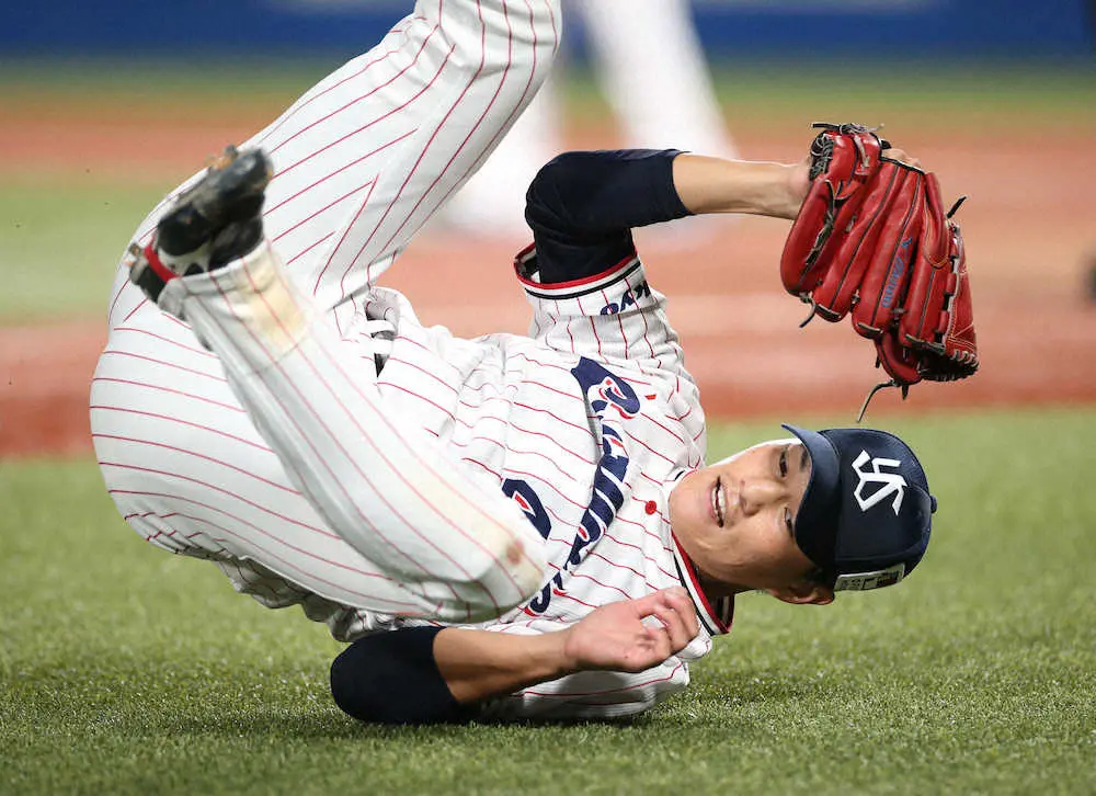 <ヤ・神>4回無死一、二塁、三塁線へのバントの打球を追って触りそうになるも、寸前で避けてファールとする高橋(撮影・北條 貴史) Photo by スポニチ ヤクルト高橋の“曲芸プレー”にスタンドどよめき バント処理で「ファウル… ギャラリーで見る この記事のフォト 2021年10月09日の画像一覧 もっと見る 2021年10月09日の画像をもっと見る