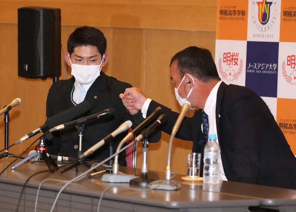 ソフトバンクから指名を受け、ノースアジア大明桜の輿石重弘監督とグータッチする風間球打(左)(撮影・西海健太郎)