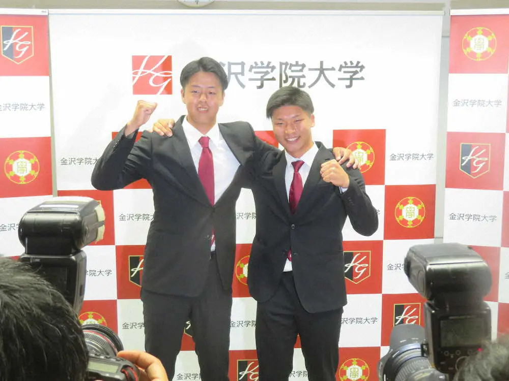 金沢学院大から楽天5位指名の松井(左)と日本ハム6位の長谷川