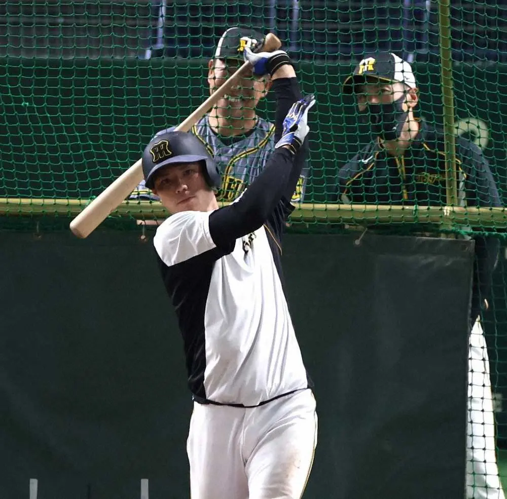 1軍に合流した栄枝は矢野監督(右)らの見守るなか打撃練習を行う(撮影・大森 寛明)