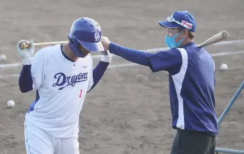 <中日キャンプ> 根尾にシンクロさせ打撃指導する立浪臨時打撃コーチ(右)(撮影・椎名 航)=沖縄・北谷
