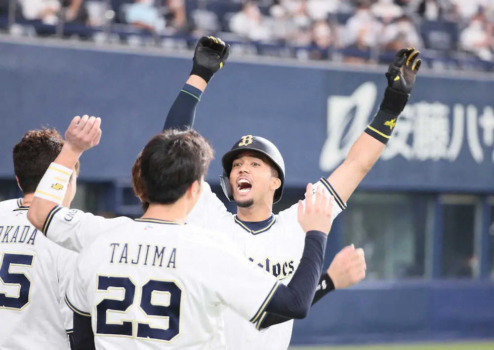 <オ・ロ(22)>8回2死一塁、同点2ランを放ち雄叫びをあげ生還し、田嶋に迎えられるオリックス・宗(撮影・後藤 正志)
