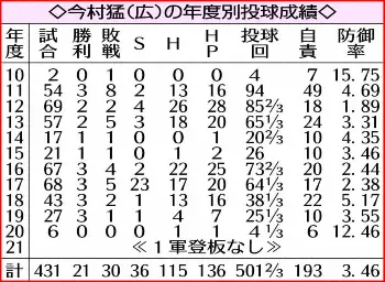 ◇今村 猛(いまむら・たける)1991年(平3)4月17日生まれ、長崎県出身の30歳。清峰では甲子園に2度出場し、3年春は優勝。09年ドラフト1位で広島入り。2年目から救援に回り、3年目の12年に自己最多69試合登板。16年から2年連続でチーム最多登板し18年までのリーグ3連覇に貢献。1メートル83、94キロ。右投げ右打ち。