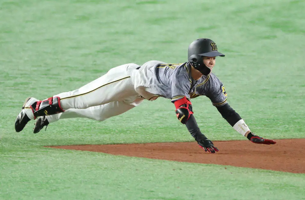 <巨・神>4回1死、阪神・中野は右翼線二塁打を放ちヘッドスライディング(撮影・大森 寛明)