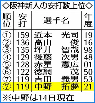 試合を重ねるごとに、見つめる景色が変わってくる。阪神・中野がまた一つ、階段を駆け上がった。10日のヤクルト戦以来、今季11度目の猛打賞で119安打に到達。球団新人歴代7位の53年吉田義男に肩を並べた。