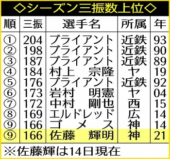 阪神・佐藤輝は8回1死から代打で出場。近大の先輩・畠との対戦はファウルで粘ったものの、8球目の真っすぐで空振り三振に終わった。フルスイングが持ち味とはいえ、これでシーズン166三振となり、球団では14年ゴメスに並ぶ最多タイ記録。球界全体でも9位タイの量産ぶりとなった。