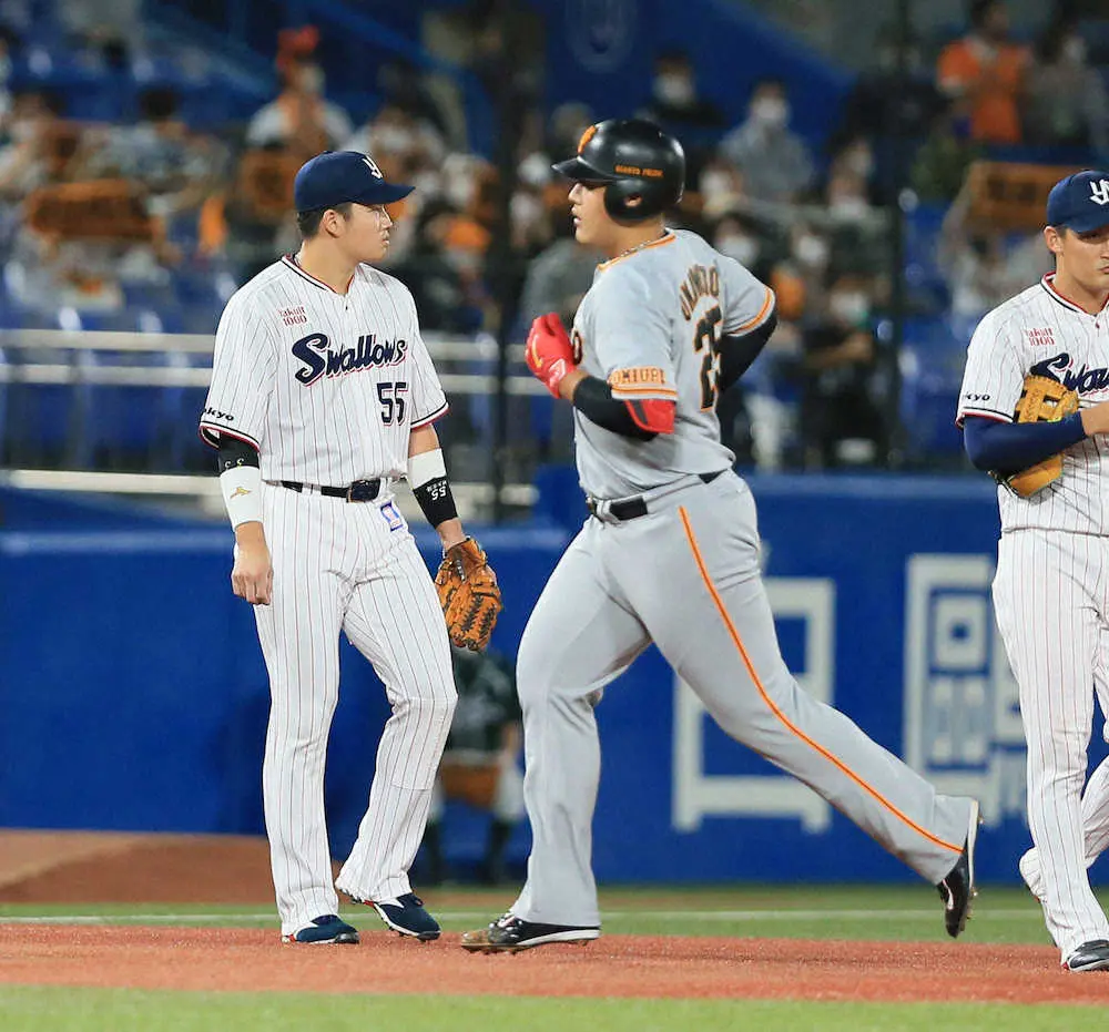 ヤクルト・村上 巨人バッテリーに警戒され3四球 岡本和に39本塁打で並ばれ、3打点差つけられる