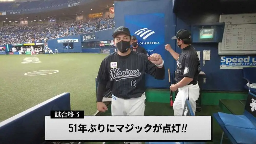ロッテ公式YouTubeチャンネルで公開された、優勝マジック点灯試合での様子 Photo by 提供写真 ロッテ、51年ぶりマジック点灯 その瞬間と舞台裏を撮影&公開 ギャラリーで見る この記事のフォト 2021年10月19日の画像一覧 もっと見る 2021年10月19日の画像をもっと見る