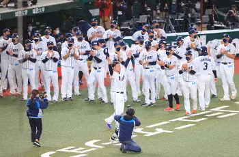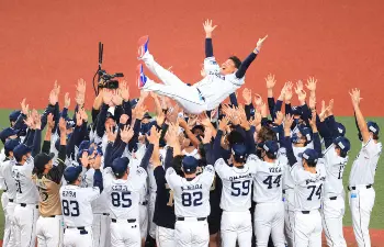 引退登板試合終了後に胴上げされる松坂(撮影・白鳥 佳樹)