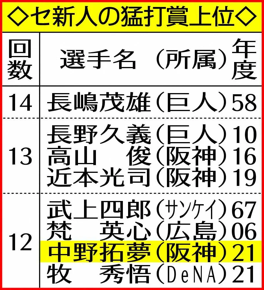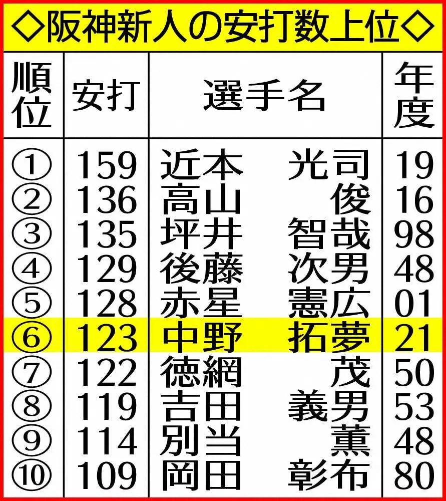 <神・ヤ>4回2死一、二塁、阪神・中野は右前適時打を放ち猛打賞(撮影・平嶋 理子) Photo by スポニチ 阪神・中野 12度目猛打賞セ新人歴代3位タイ 30盗塁も王手 逆転Vへ「強… ギャラリーで見る この記事のフォト 2021年10月20日の画像一覧 もっと見る 2021年10月20日の画像をもっと見る