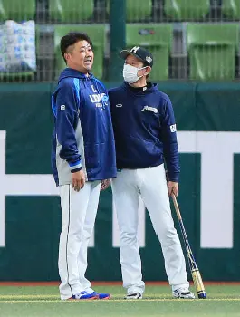 <西・日>試合前、笑顔で荒木コーチと記念撮影する松坂 (撮影・白鳥 佳樹)