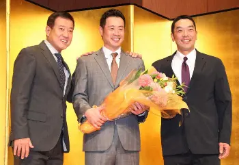 巨人・亀井引退会見 原監督&阿部コーチが花束贈呈 原監督「ジャイアンツにおいての守り神」