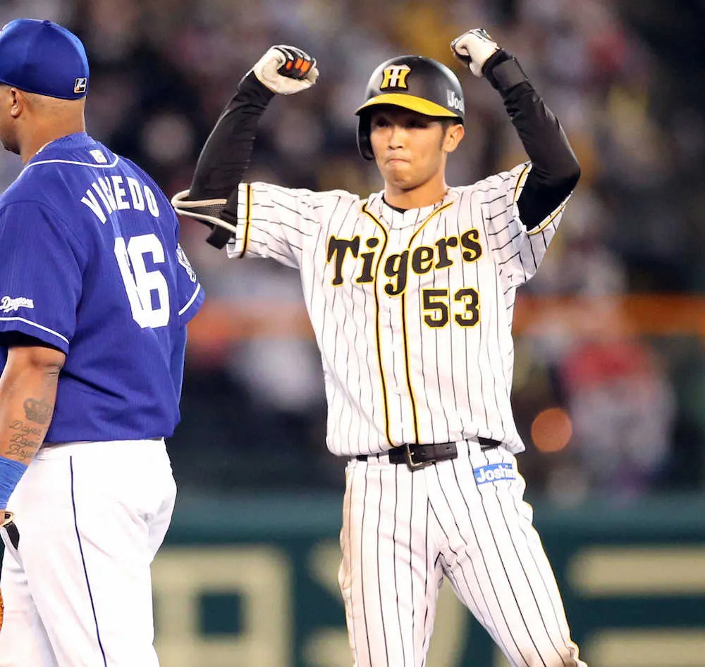 <神・中24>2回1死二、三塁、島田は左中間に2点適時二塁打を放ち、ベンチに向かってガッツポーズ(撮影・北條 貴史)
