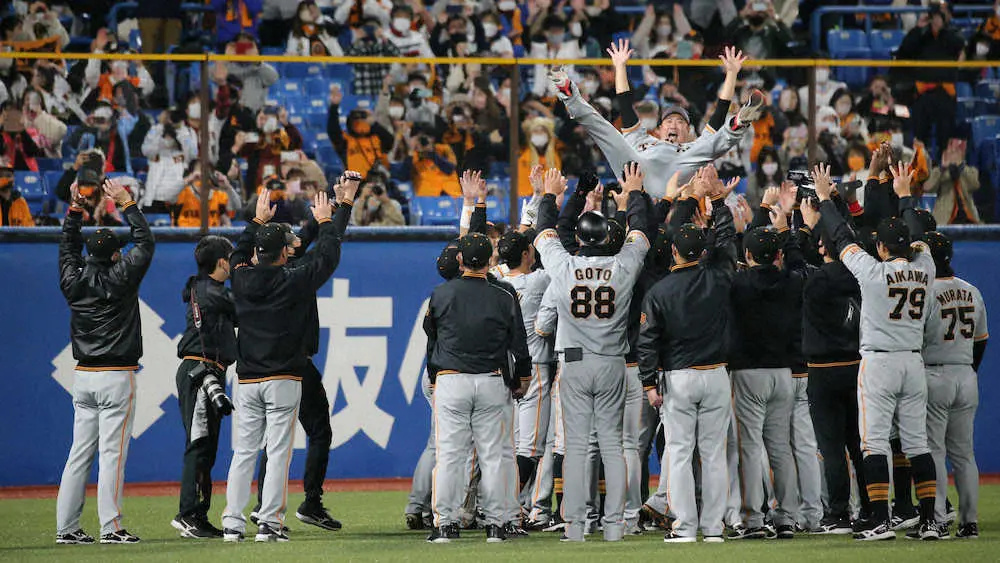 今季最終戦を落とし、3年ぶりの借金1で今季終了となった巨人だが、試合終了後は敵地に駆けつけてくれた三塁側、左翼側のファンのもとへ全員で向かってあいさつ。その中心にいた大竹にナインが近づくと、仲間の手で5度宙に舞った。前日23日のヤクルト戦(東京D)後に引退セレモニーを行った亀井善行外野手(39)は涙、涙の引退となったが、大竹は最後まで“寛ちゃんスマイル”。プロ20年の現役生活を終えた充実感をにじませ、笑顔で神宮球場を後にした。