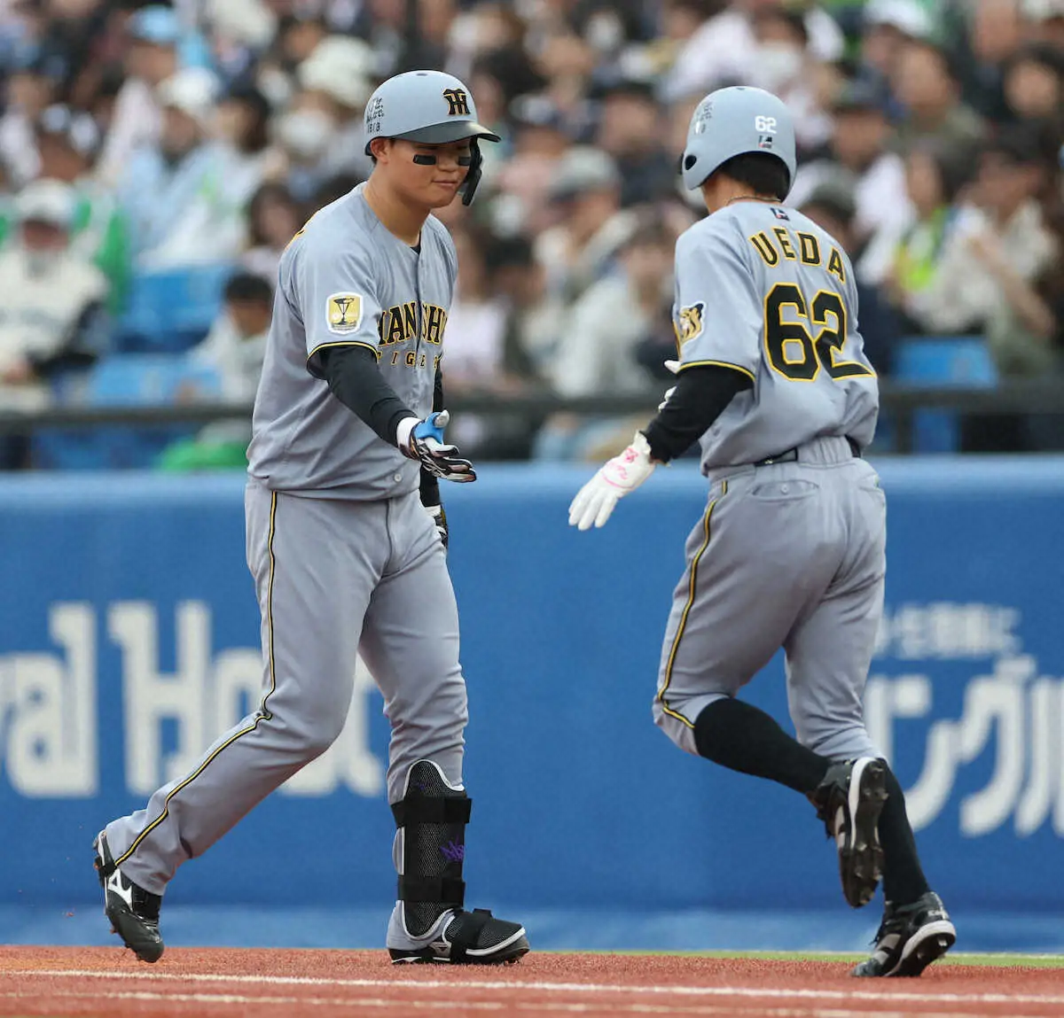 高橋(右)と笑顔の阪神・青柳(左)(撮影・平嶋 理子)