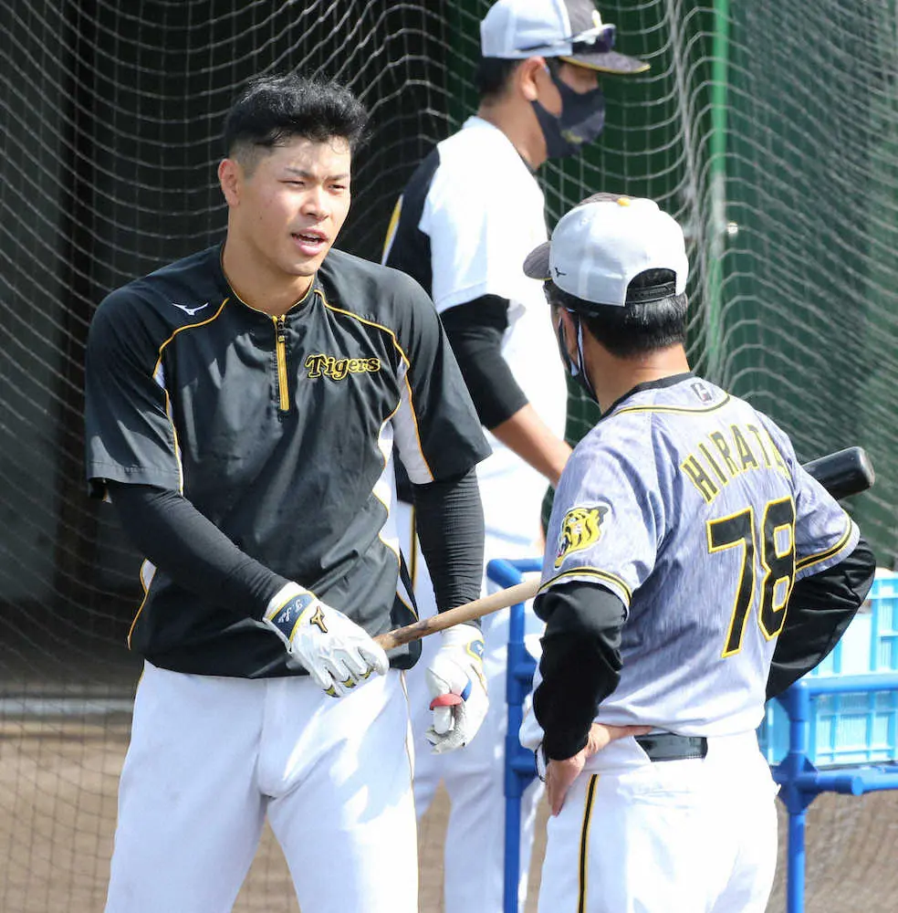 <フェニックスL ヤ・神>平田2軍監督(右)と話す佐藤輝(撮影・坂田 高浩)