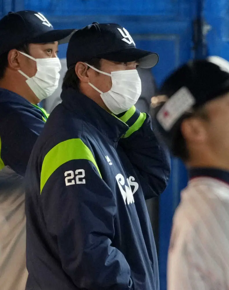 セガサミーとの練習試合の4回、ベンチで試合を見つめる高津監督(撮影・島崎 忠彦)