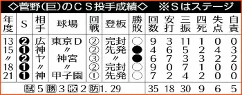 《球団最多タイ3勝》菅野(巨)が7回無失点でCS通算3勝目。プレーオフ、CSの通算最多勝利は中田賢一(ソ)の6勝で、3勝以上は菅野が19人目。巨人で3勝は越智大祐が全て救援でマークしたのと並ぶ最多タイ。オール先発は菅野が初めてだ。これでCSの通算防御率は1・29。甲子園では初登板だったが、敵地では2勝1敗、防御率0・82と1点未満をキープしている。