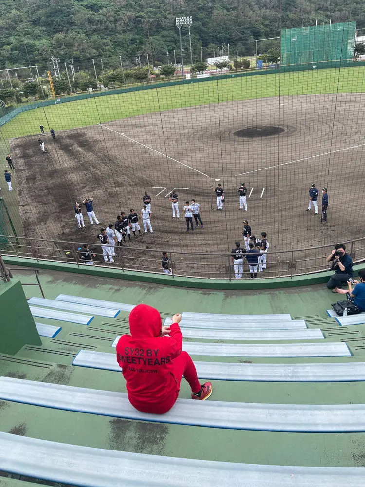スタンドに移動して練習をチェックする新庄監督
