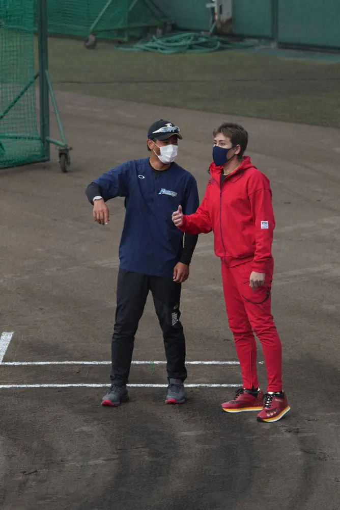 稲葉GMと話をする新庄監督