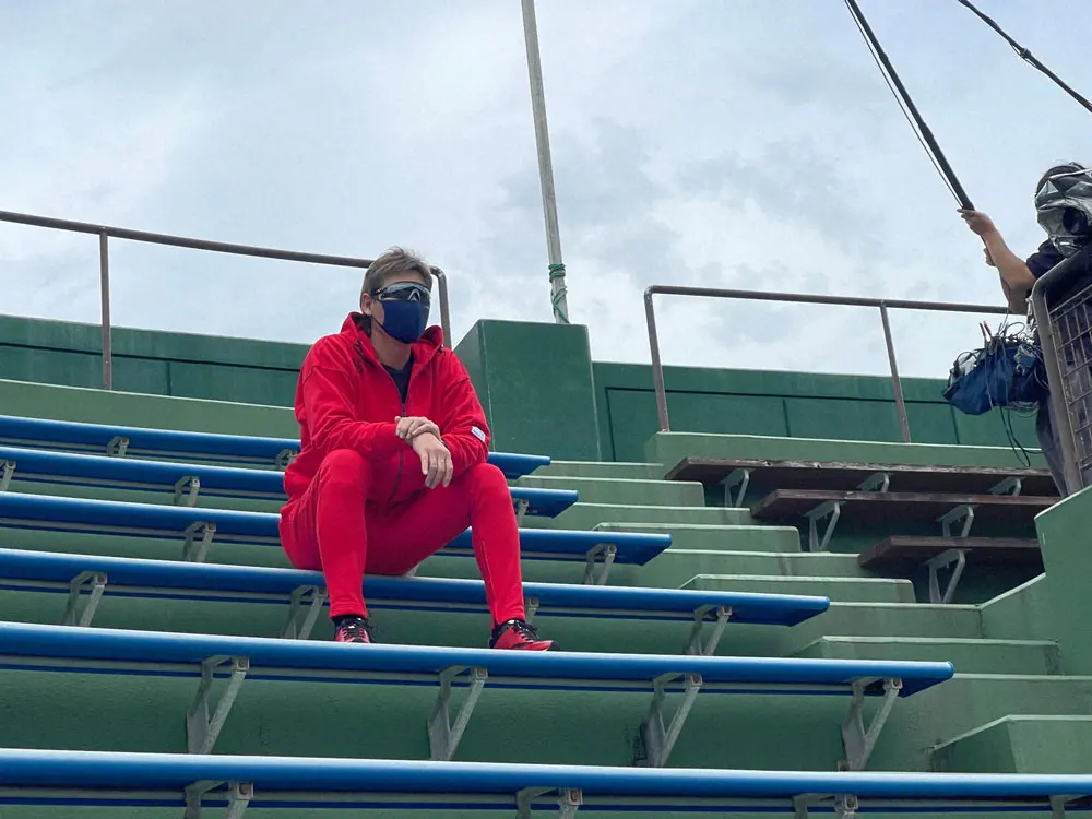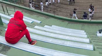 スタンドに移動して練習をチェックする新庄監督