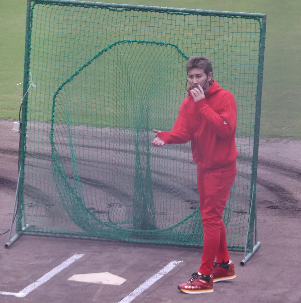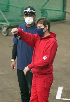 バント用打撃マシンを調整し、実際に打席で調整の出来を確認する新庄監督