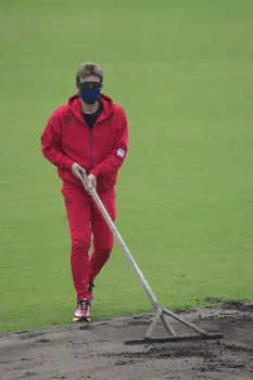 トンボがけしてグラウンド整備する新庄監督