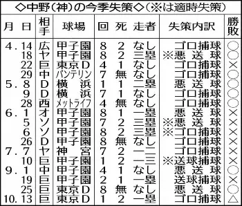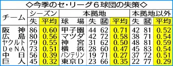 《少ない奪三振も影響か》阪神投手陣の今季奪三振数986はリーグ最少。最多のヤクルト(1129)とは143も差があった。青柳やガンケルら打たせて取るタイプが多いことが守備機会の増加につながり、失策数にも影響したとみられる。中野の遊撃守備率・970は、同じ25歳シーズンでは06年鳥谷の・971(21失策)とほぼ同じ。鳥谷は07年・983、08年・980、09年・990と守備率を上げたが、中野はどうか。