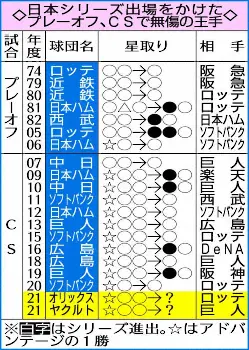 ○…オリックスとヤクルトがアドバンテージの1勝を含めて3勝0敗とし、日本シリーズ進出に王手をかけた。シリーズ出場を懸けたプレーオフ、CSで無傷の王手は過去18チームあり、突破率は100%。両リーグともに無傷で王手となったケースは初めてだ。規定により勝利数が並んだ場合は上位チームが勝者となるため、シーズン1位の両軍は、きょう12日の第3戦で勝つか引き分ければ、日本シリーズ進出が決まる。