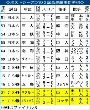 ○…オリックスとヤクルトがそろって1、2戦を零封勝利。CSの2試合連続零封勝利は16年ファイナルS第1、2戦の広島以来5年ぶり4、5度目で、パ・リーグでは初めて。日本シリーズを含めたポストシーズン11度でも、オリックスはチーム初の快挙。2試合で3得点は55年日本シリーズ第2、3戦の南海4得点を下回る最少記録となった。またヤクルトは15年CSファイナルS第2、3戦に続く2度目。前回も巨人が相手だった。