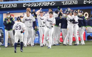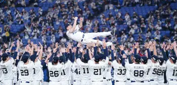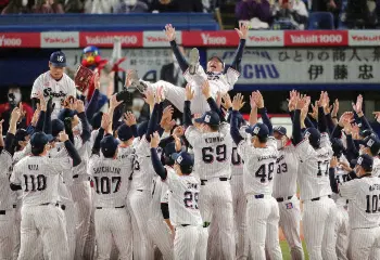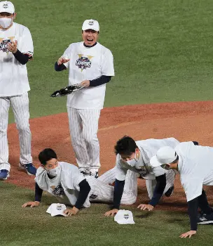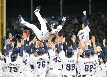 日本シリーズ進出を決めてナインと一緒にマウンド付近に歩みを進めた高津監督。輪になった優勝戦士の中で田口が大きな声を上げる。おそらくシーズンの時と同様に監督の背番号と同じ22回胴上げしようといったところか。その声を制して「5回頼むわぁ~!」。笑顔の高津監督は「シーズンの胴上げは横浜だったんで。神宮で胴上げしてもらいたいという念願かないました」と秋の神宮の夜空に5度舞った。