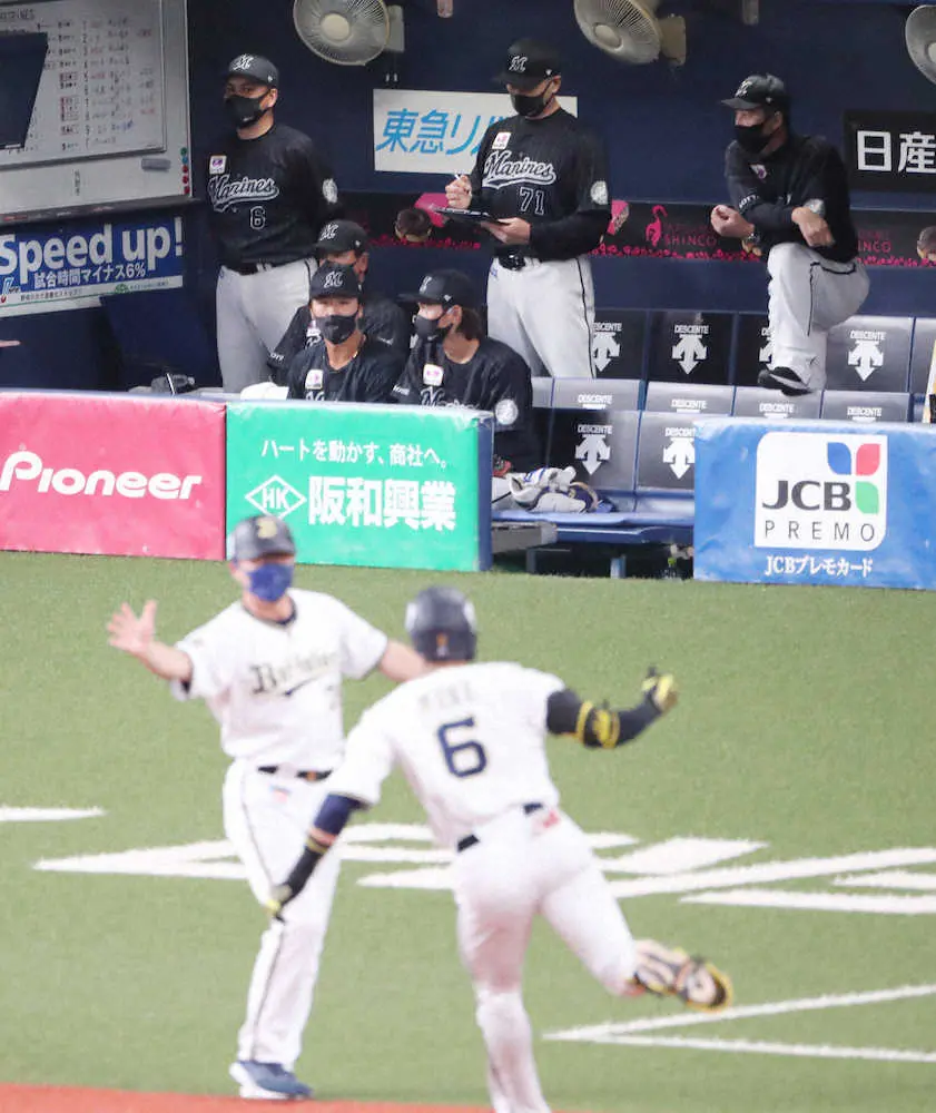 6回1死一塁、宗(右手前)に逆転となる右越え2ランホームランを打たれ、ガックリの井口監督(左)らロッテベンチ(撮影・椎名 航)