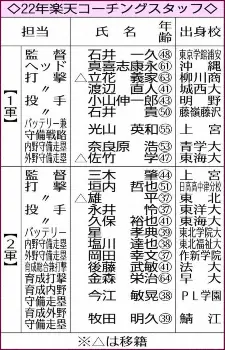 ≪楽天来季スタッフ発表 新任コーチは3人≫楽天は13日、来季の1、2軍のコーチングスタッフを発表した。新任は立花1軍打撃コーチ、佐竹1軍外野守備走塁コーチ、雄平2軍打撃コーチ。1軍担当だった岡田外野守備走塁コーチが2軍に、金森打撃コーチは育成担当に配置転換された。石井監督は選手へ「できていること、できないことをコーチと一緒に考えて取り組んでほしい」と訓示した。