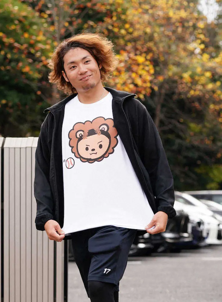 日本ハム・伊藤 ファンから贈られた似顔絵イラスト入りTシャツお披露目 早速着用